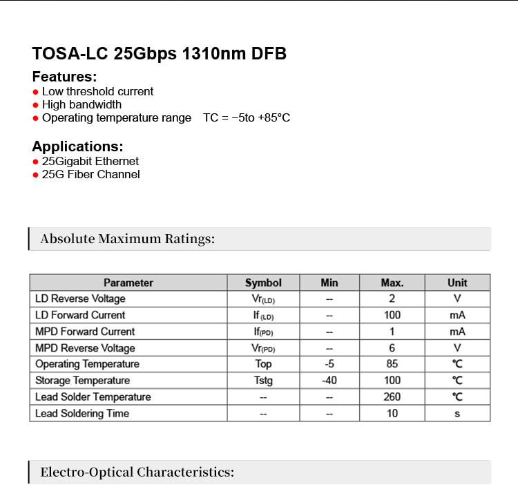 25Gbps 1310nm TOSA-LC DFB Transmitter Optical Subassembly